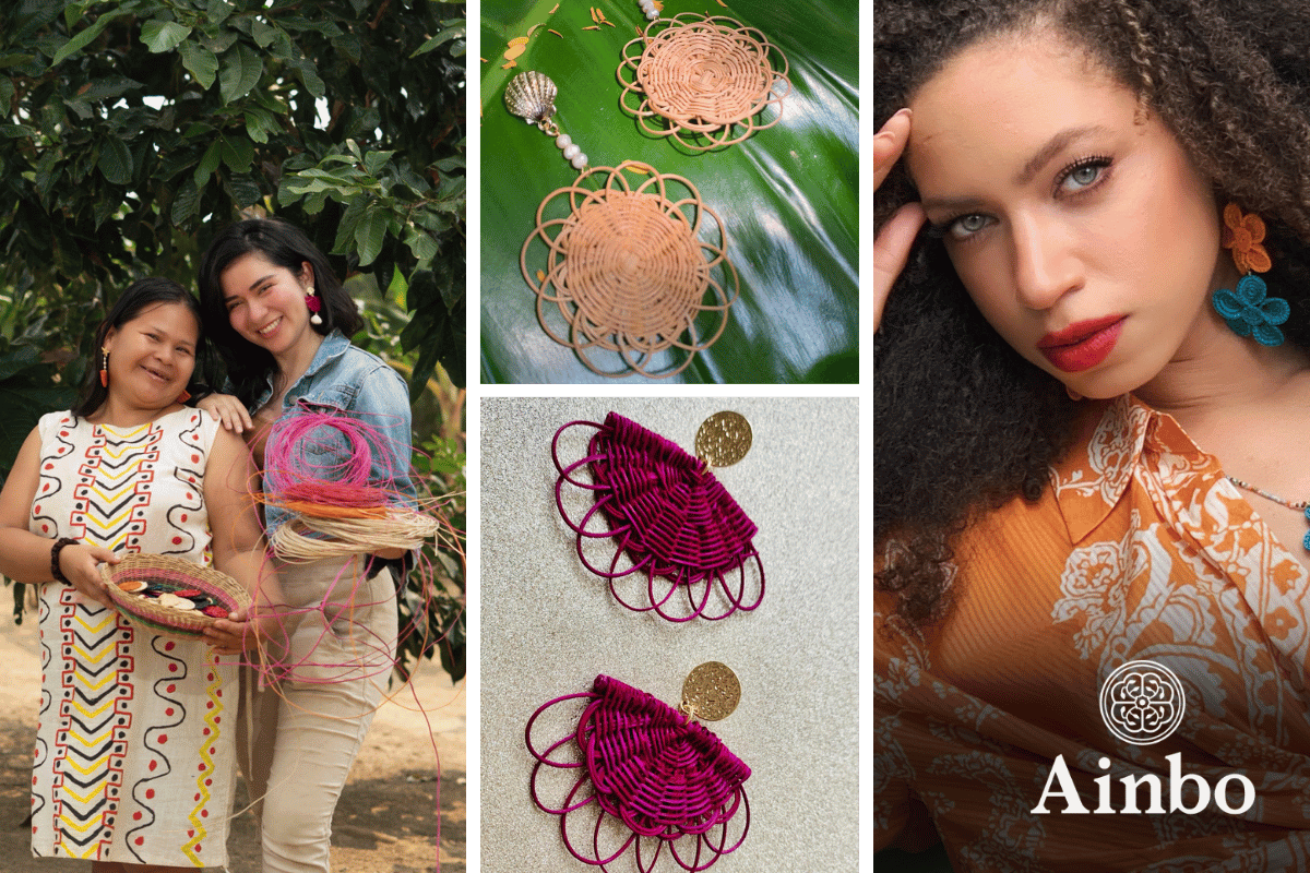 AINBO trabaja con mujeres artesanas que elaboran piezas a mano utilizando fibras vegetales amazónicas. Su propuesta rescata técnicas ancestrales y pone en valor la creatividad, la identidad y el rol de las mujeres amazónicas en la preservación de sus territorios.
